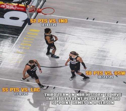 12月4日掘金135-120大胜步行者,穆雷25投19中,三分11中10,罚球5投4中,狂轰52分6篮板4助攻。掘金本赛季已有三人砍下50+(约基奇、戈登和穆雷),NBA史上第三次出现,此前两队是1961-62赛季的湖人和2018-19赛季的勇士。